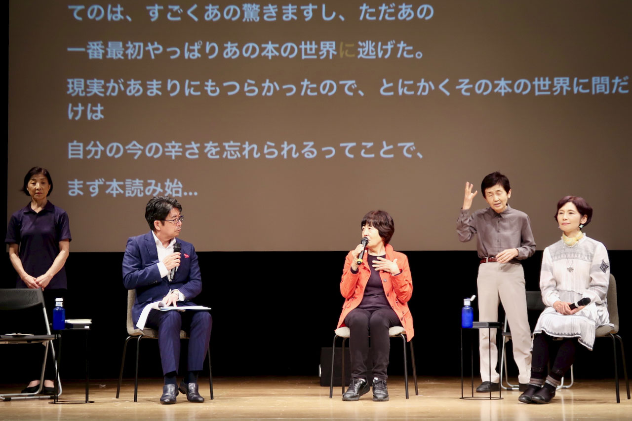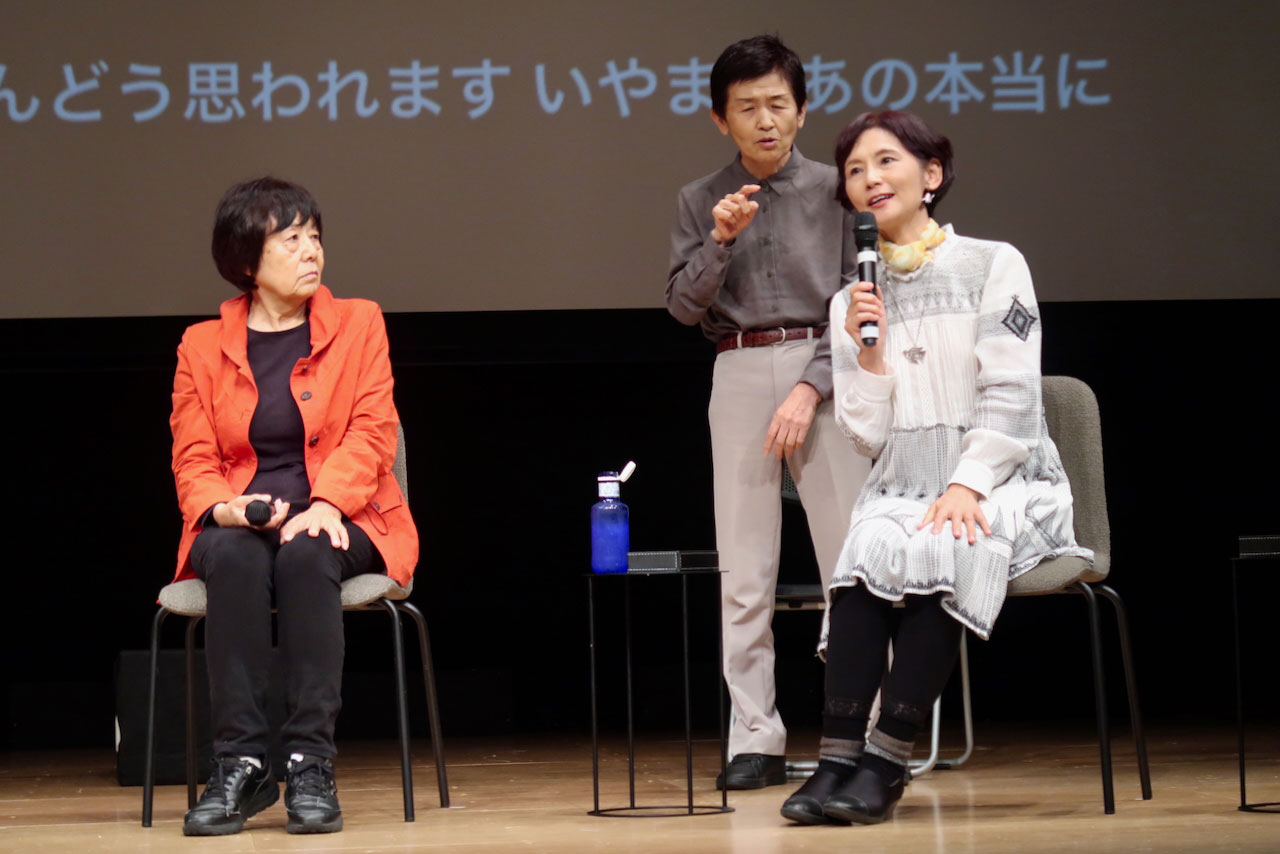 皆様、大変お待たせいたしました。これより『かづゑ的』上映会のトークショーを始めます。本日は熊谷博子監督、ナレーションを担当された斉藤とも子さんをお迎えしています。聞き手はフリーアナウンサーの高橋巨典さんです。どうぞ拍手でお迎えください。
